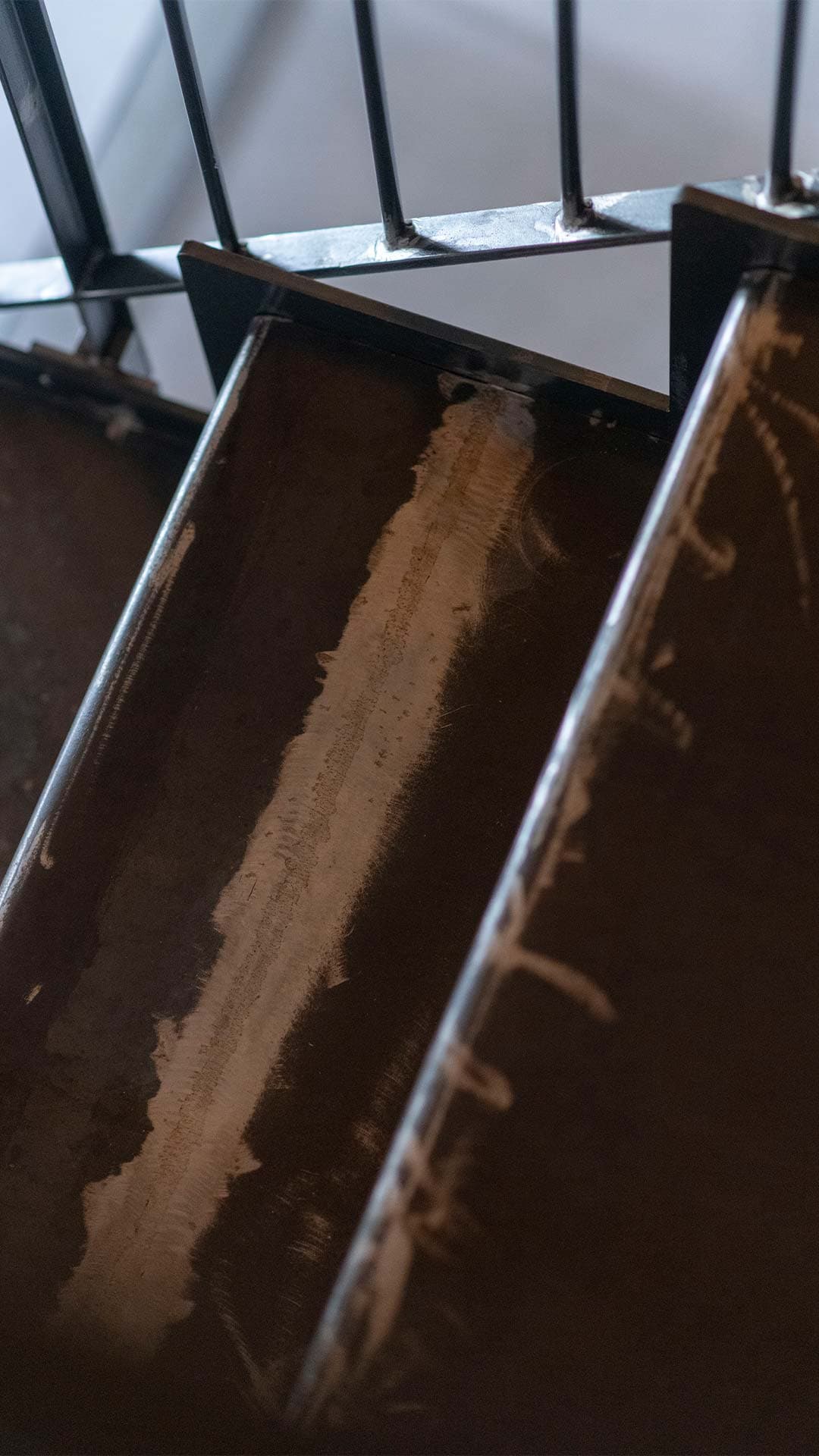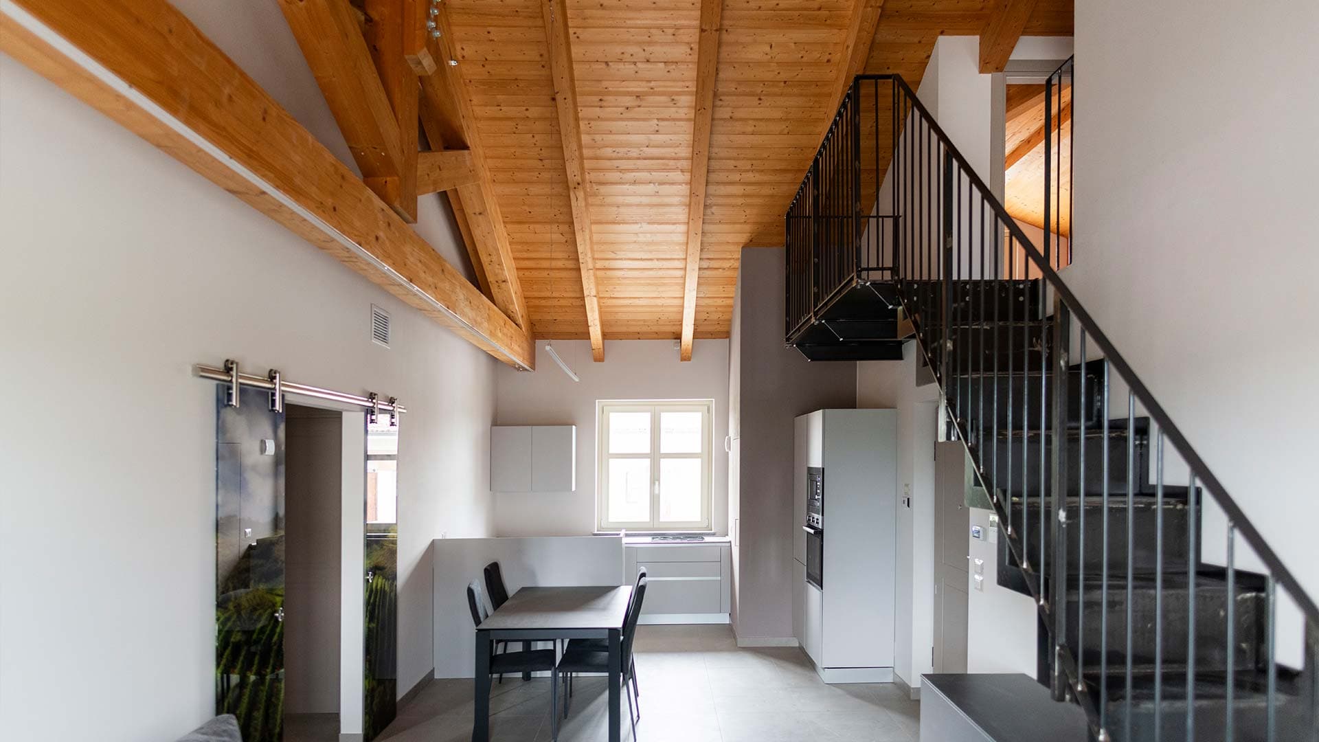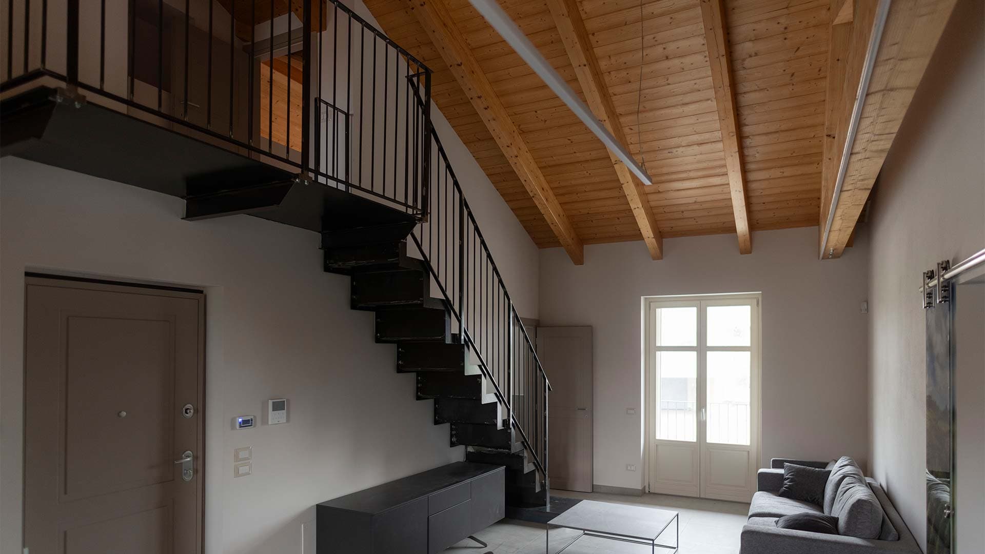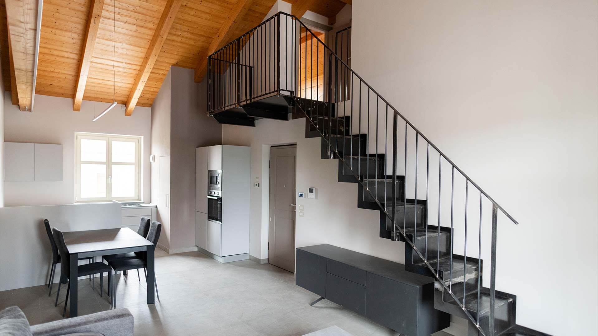 Un ampio open space che unisce l’essenzialità dello stile industriale alla calda matericità del soffitto in legno a vista. La scala in ferro nero, protagonista architettonica dell’ambiente, dialoga con arredi minimal e finiture sobrie, creando un perfetto equilibrio tra funzionalità e design contemporaneo.