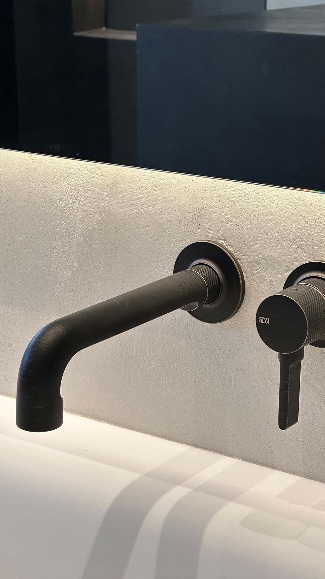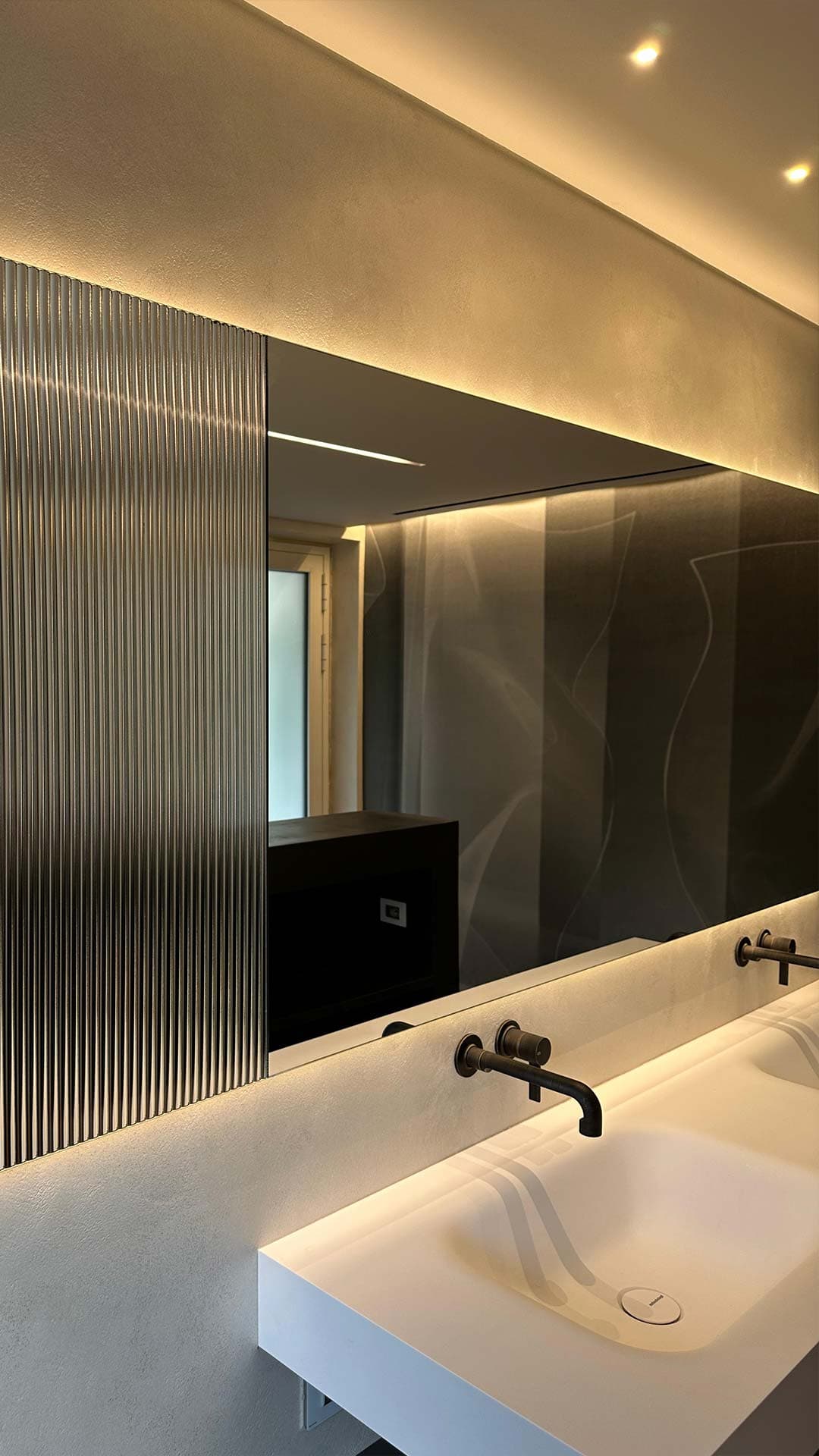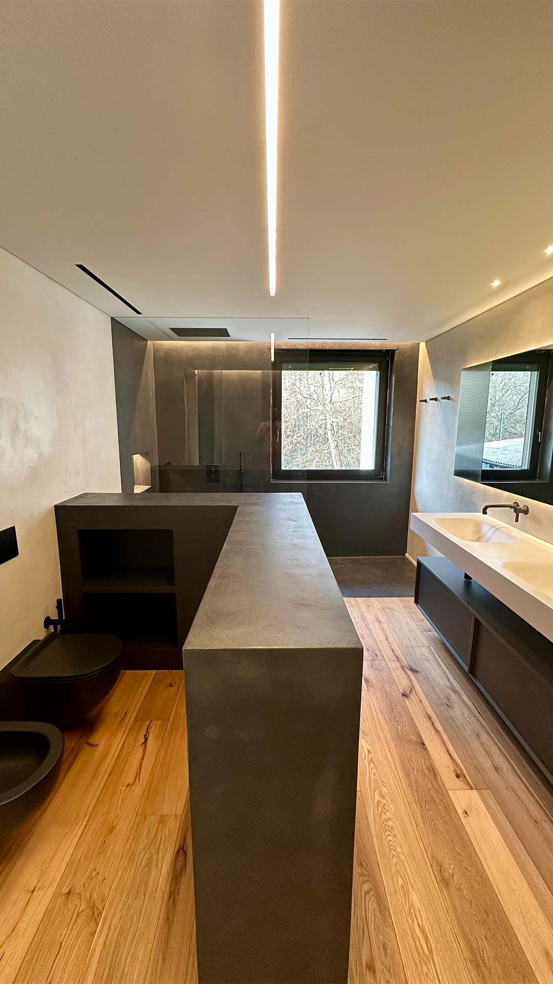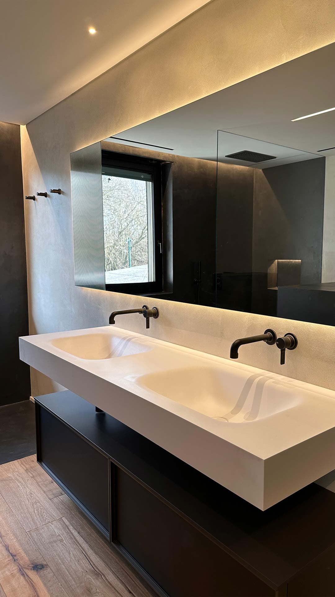 Un bagno dal carattere deciso, dove il contrasto tra superfici in resina, legno naturale e linee architettoniche pulite crea un ambiente sofisticato e armonico. La doppia postazione lavabo e l’illuminazione integrata completano uno spazio pensato per il comfort quotidiano in chiave contemporanea.