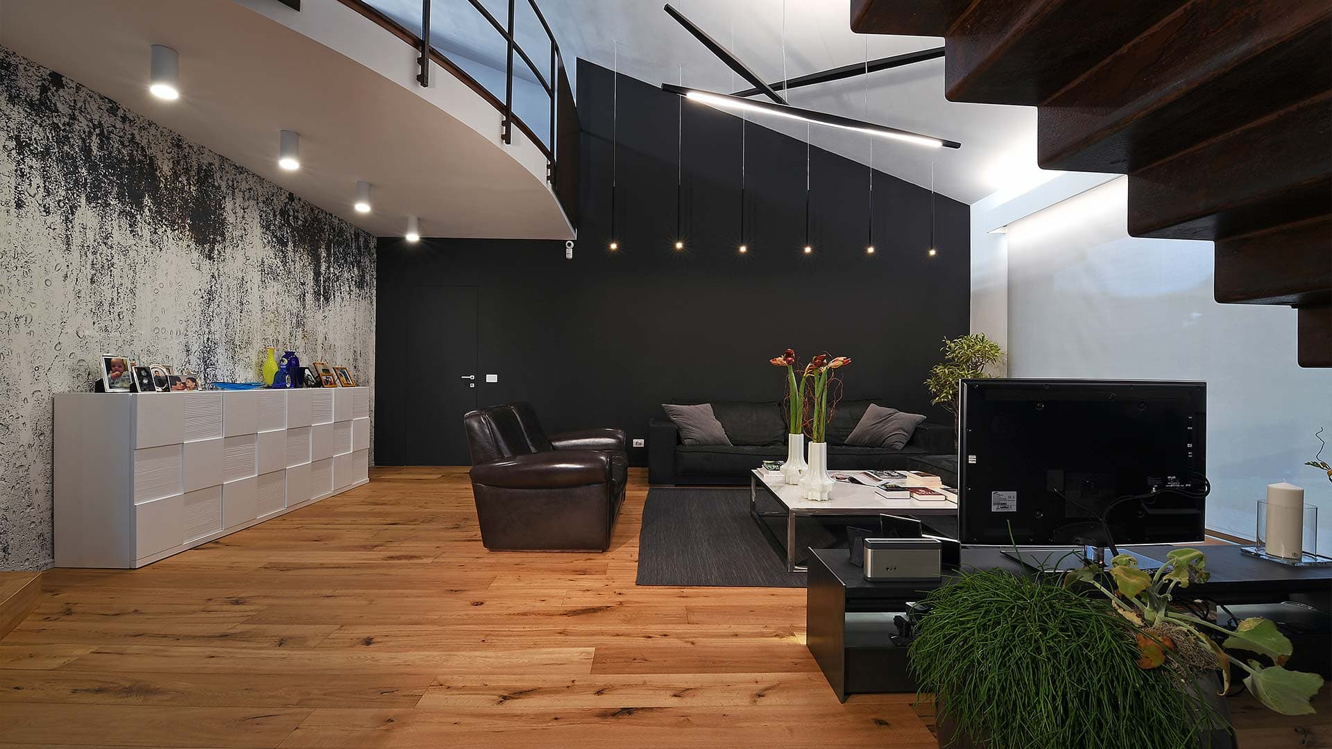 Un ampio open space su due livelli dal carattere deciso, dove elementi industriali come la scala in ferro e le luci a sospensione si integrano con materiali naturali e arredi contemporanei. La parete decorativa dal forte impatto visivo e il layout fluido rendono questo living un ambiente dal fascino metropolitano, perfetto per chi ama l’architettura di personalità.