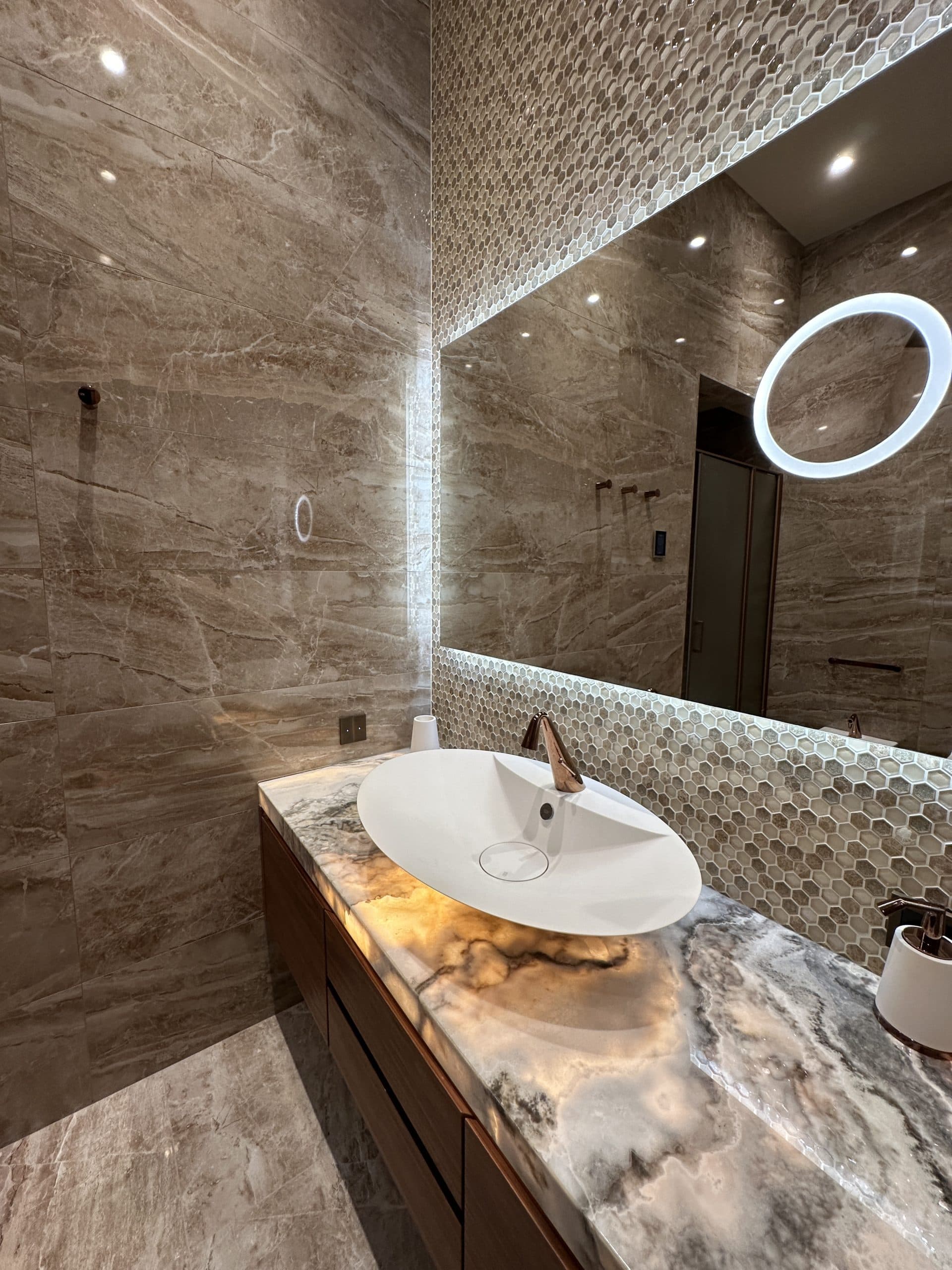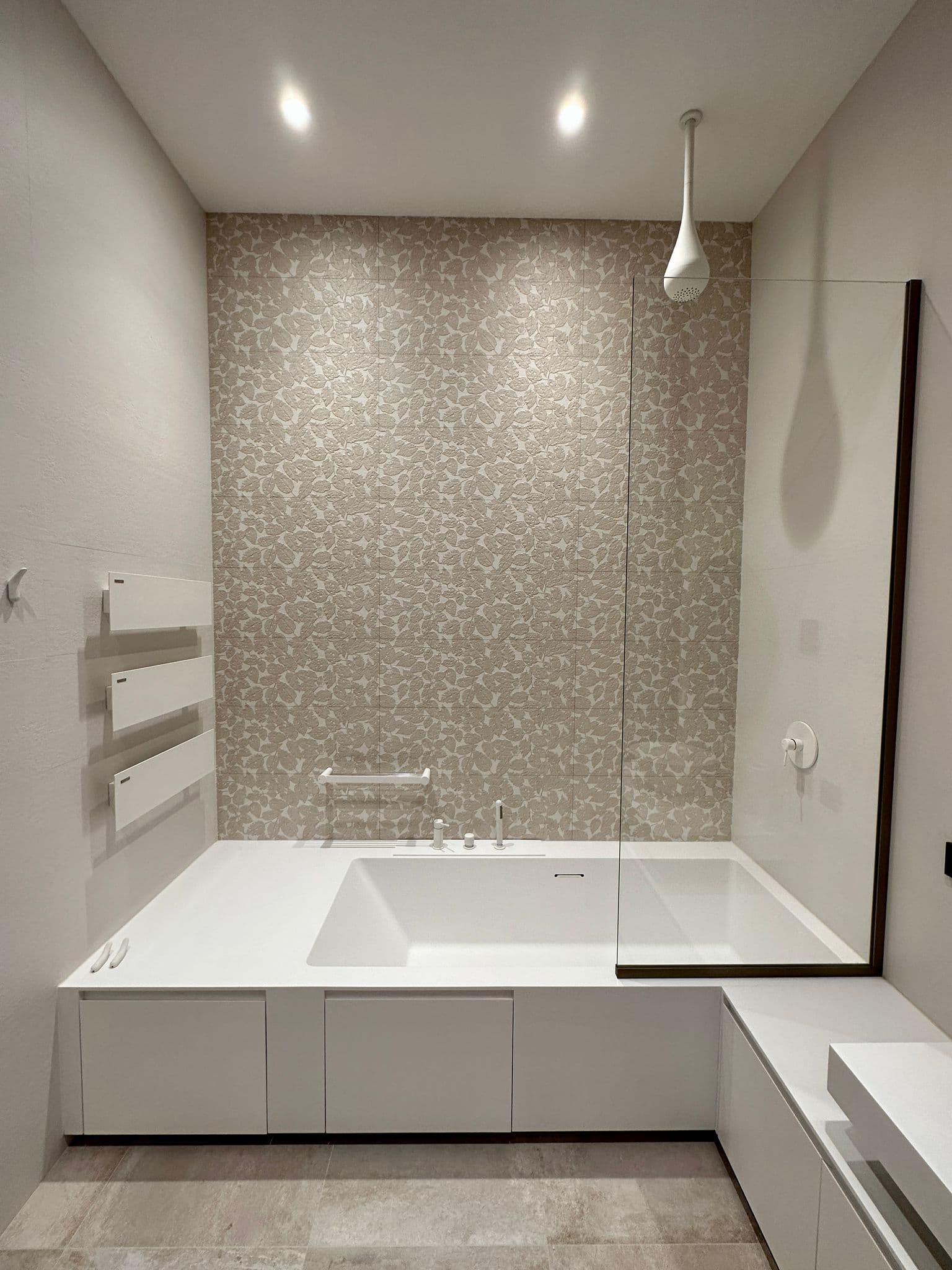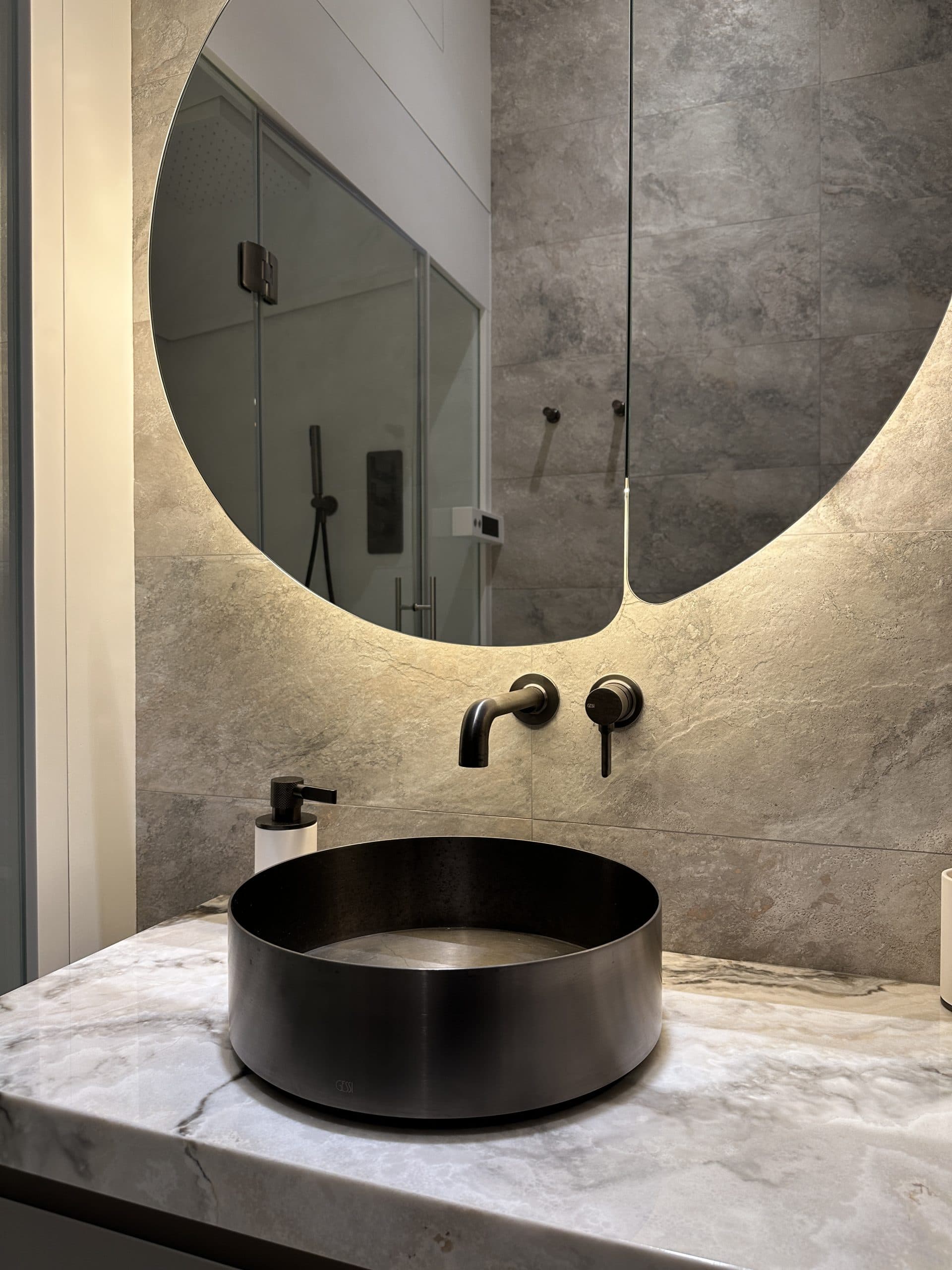 Un bagno elegante e luminoso, dove tonalità neutre e forme morbide si fondono con una raffinata texture floreale. Il lavabo d’appoggio rotondo, il miscelatore scultoreo e la vasca integrata valorizzano lo spazio con essenzialità e grazia.