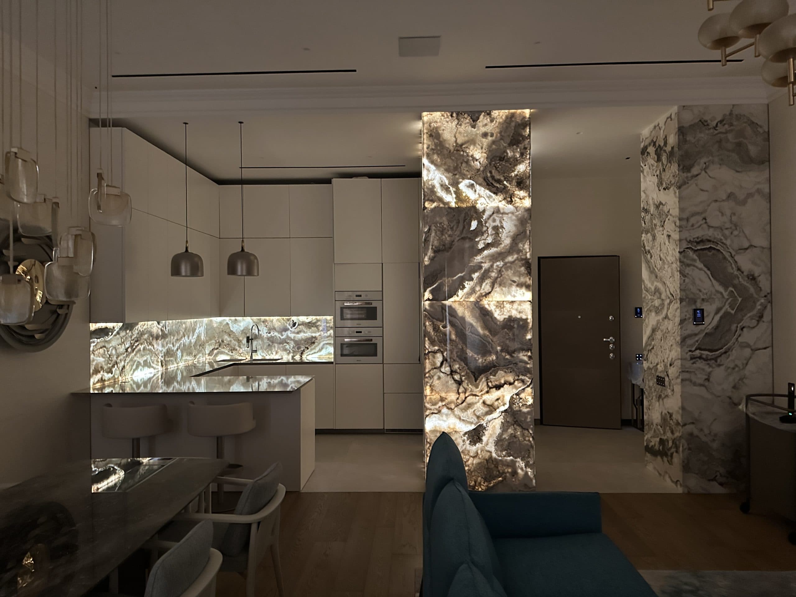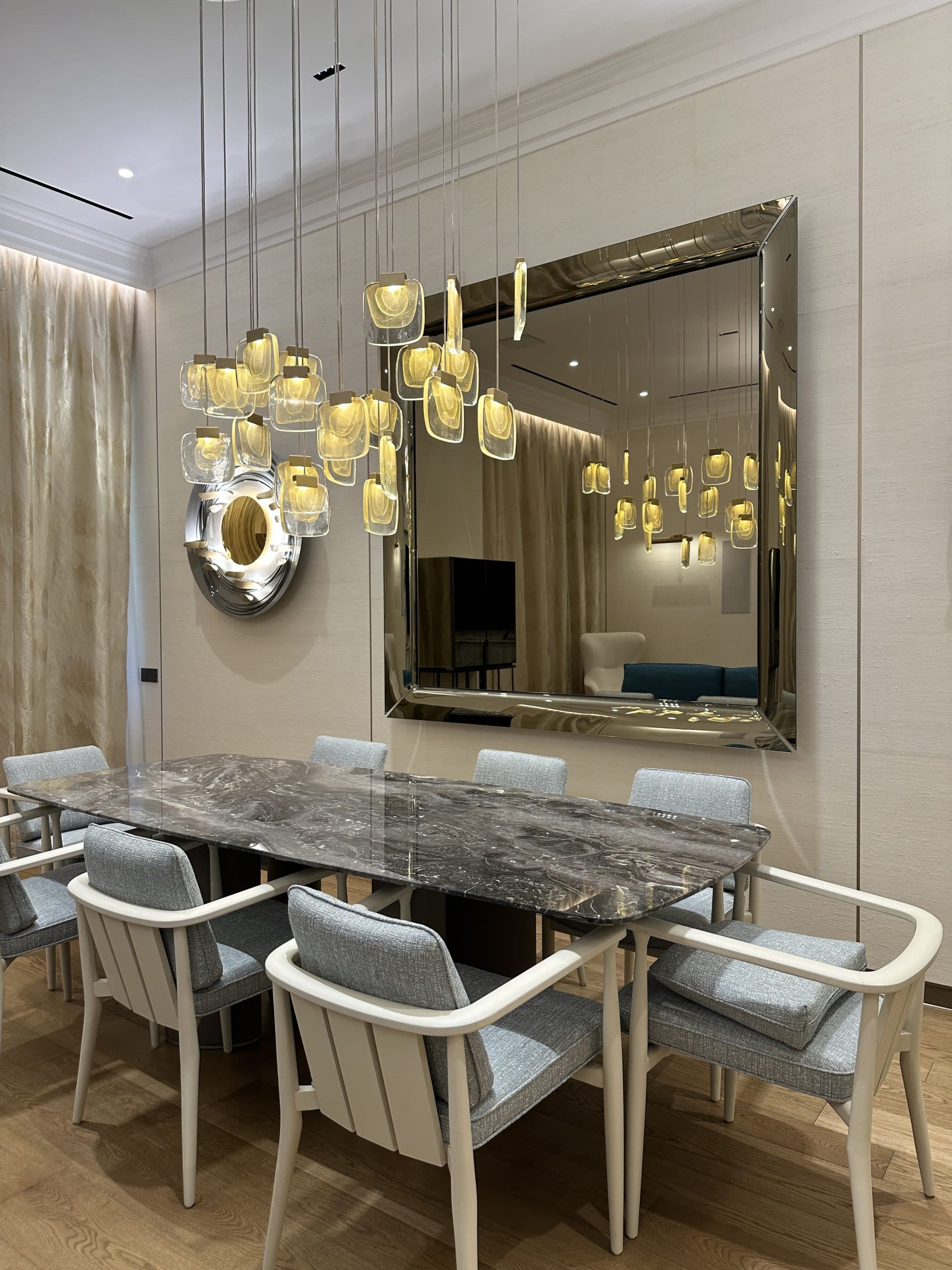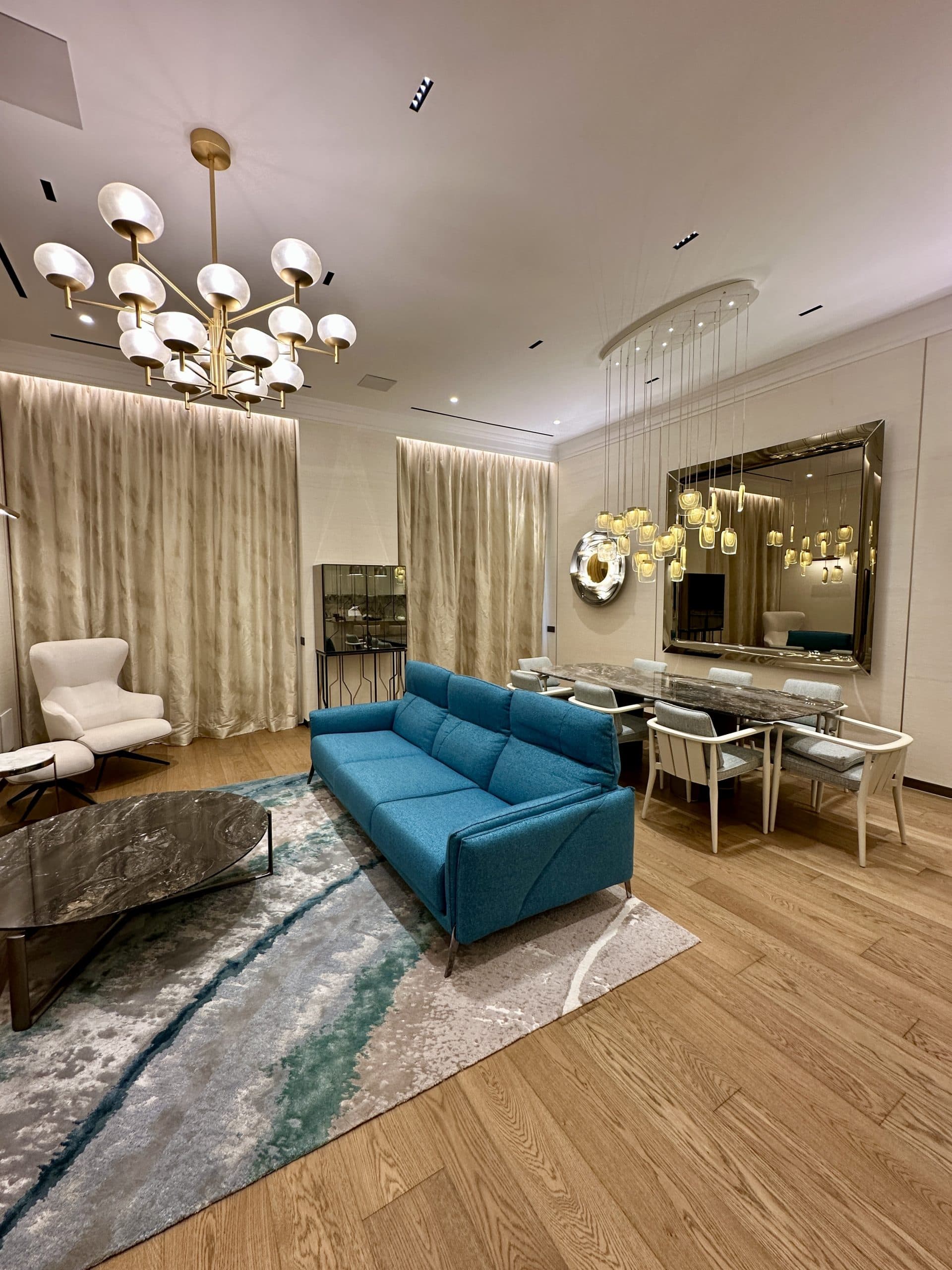 Un ambiente living e dining sofisticato, dove materiali pregiati e design ricercato si incontrano: il marmo scenografico, i corpi illuminanti scultorei e il contrasto tra toni caldi e dettagli audaci come il divano blu petrolio creano un’atmosfera esclusiva, perfetta per vivere e ricevere con stile.