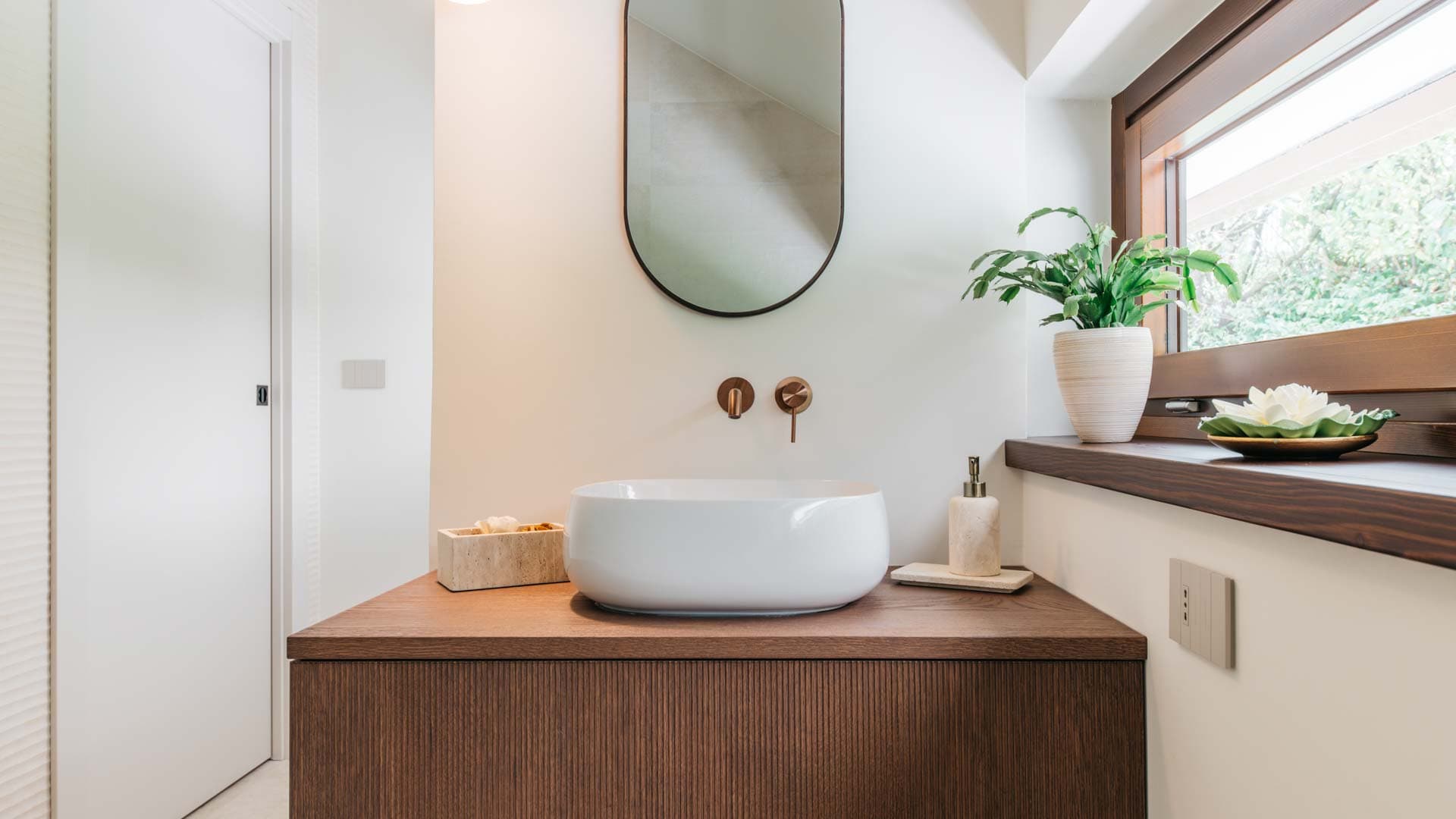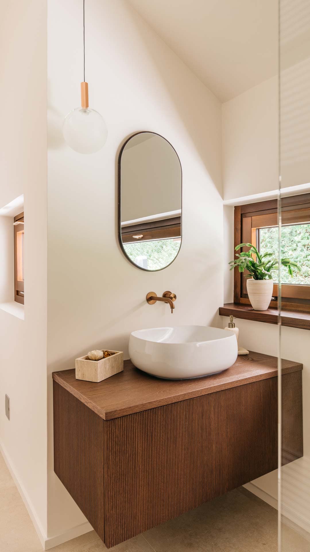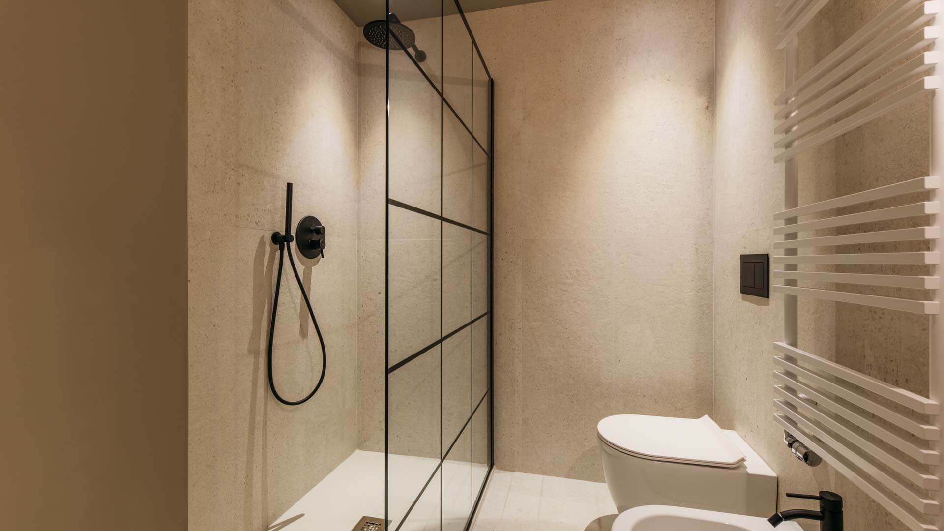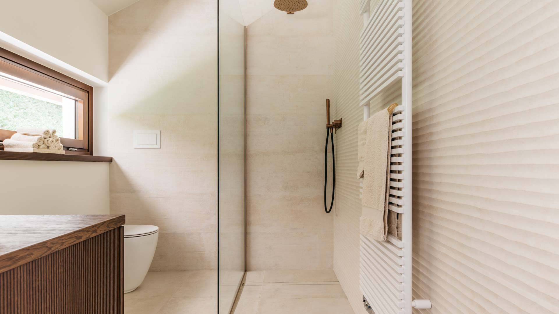 Un ambiente bagno dal design essenziale e luminoso, dove tonalità neutre, materiali naturali e linee pulite creano uno spazio armonioso e funzionale. La doccia walk-in con soffione a pioggia e gli accessori in finitura bronzo completano un’atmosfera elegante e rilassante.