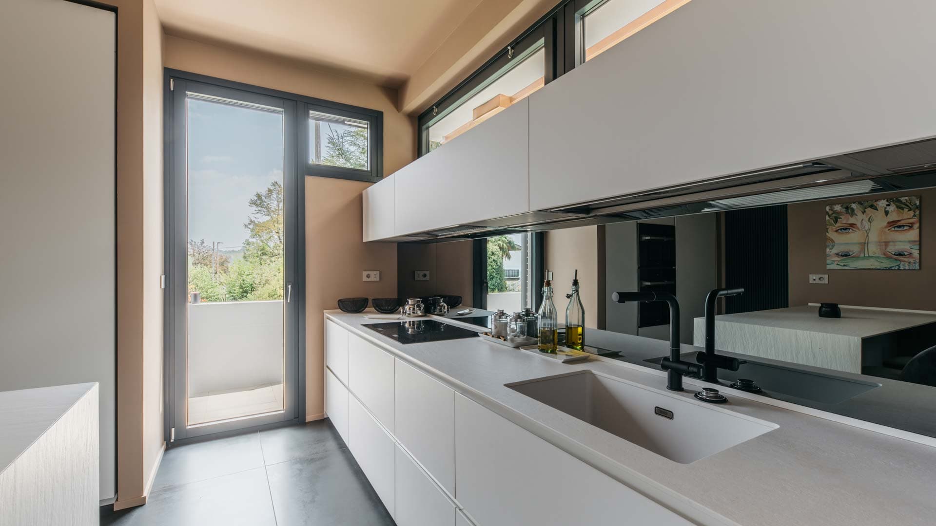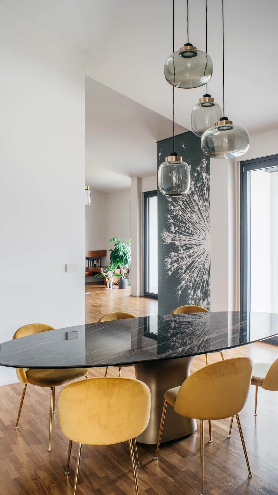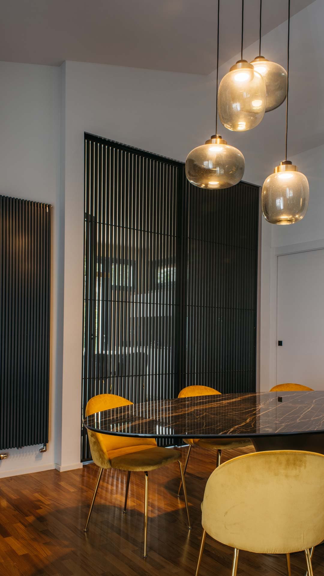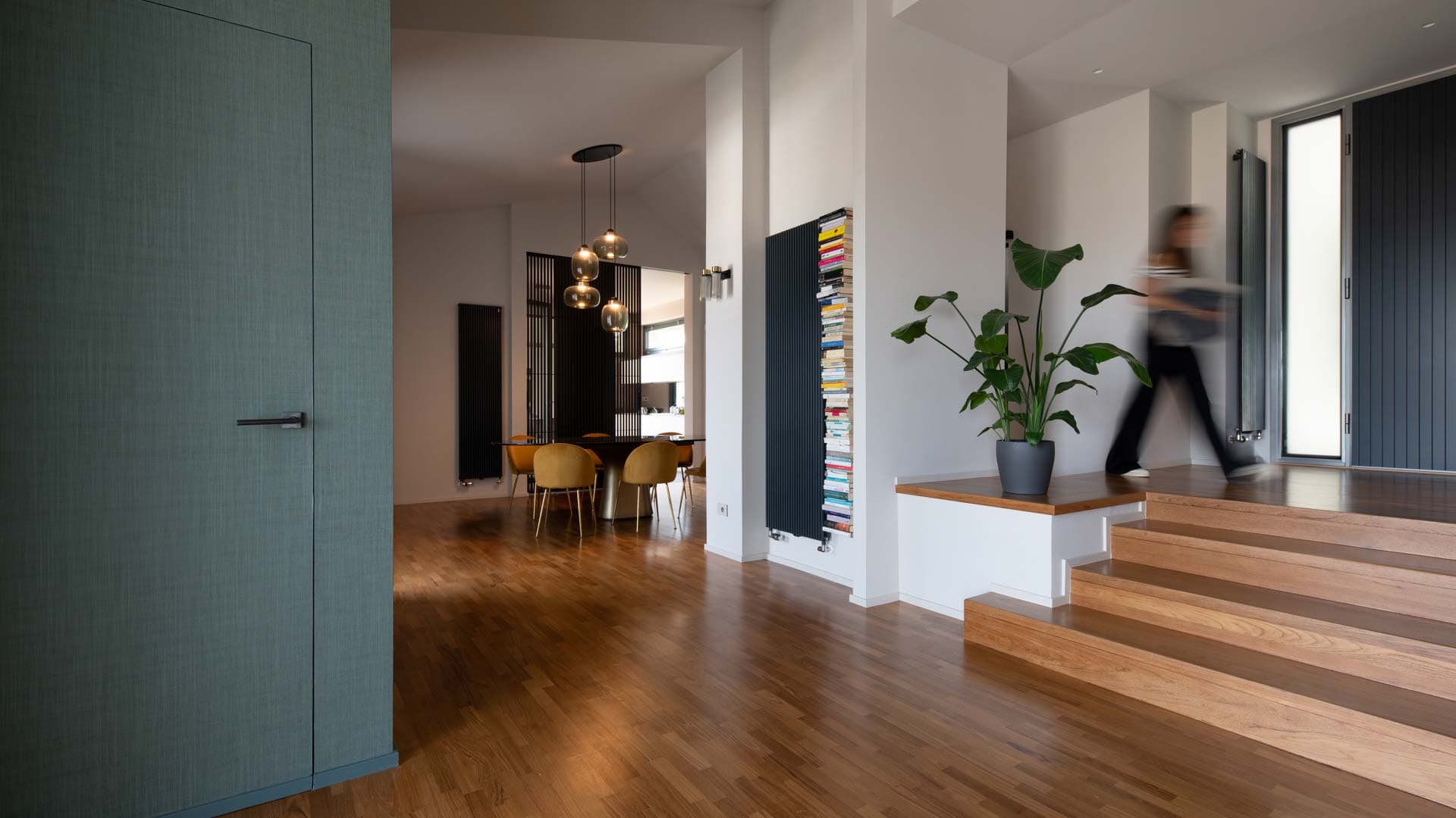 Un ingresso luminoso e articolato, dove il movimento dei volumi si integra con materiali naturali e dettagli di design. Il parquet caldo, la scala integrata e gli arredi contemporanei definiscono uno spazio accogliente e raffinato, ideale per una casa moderna e funzionale.