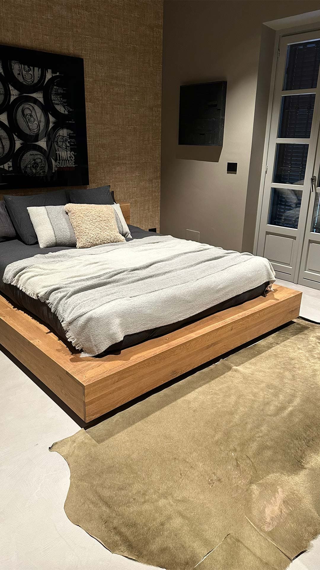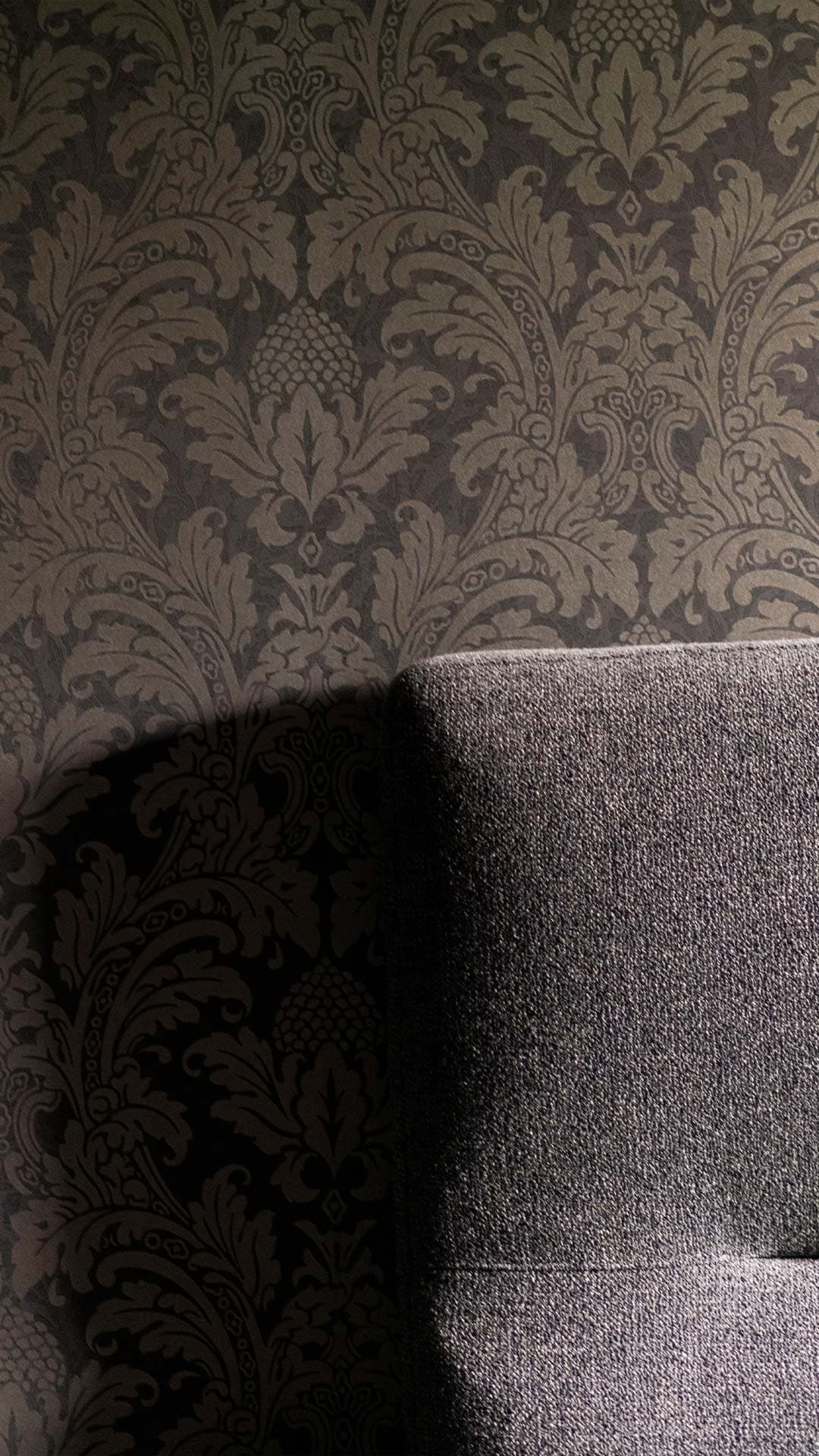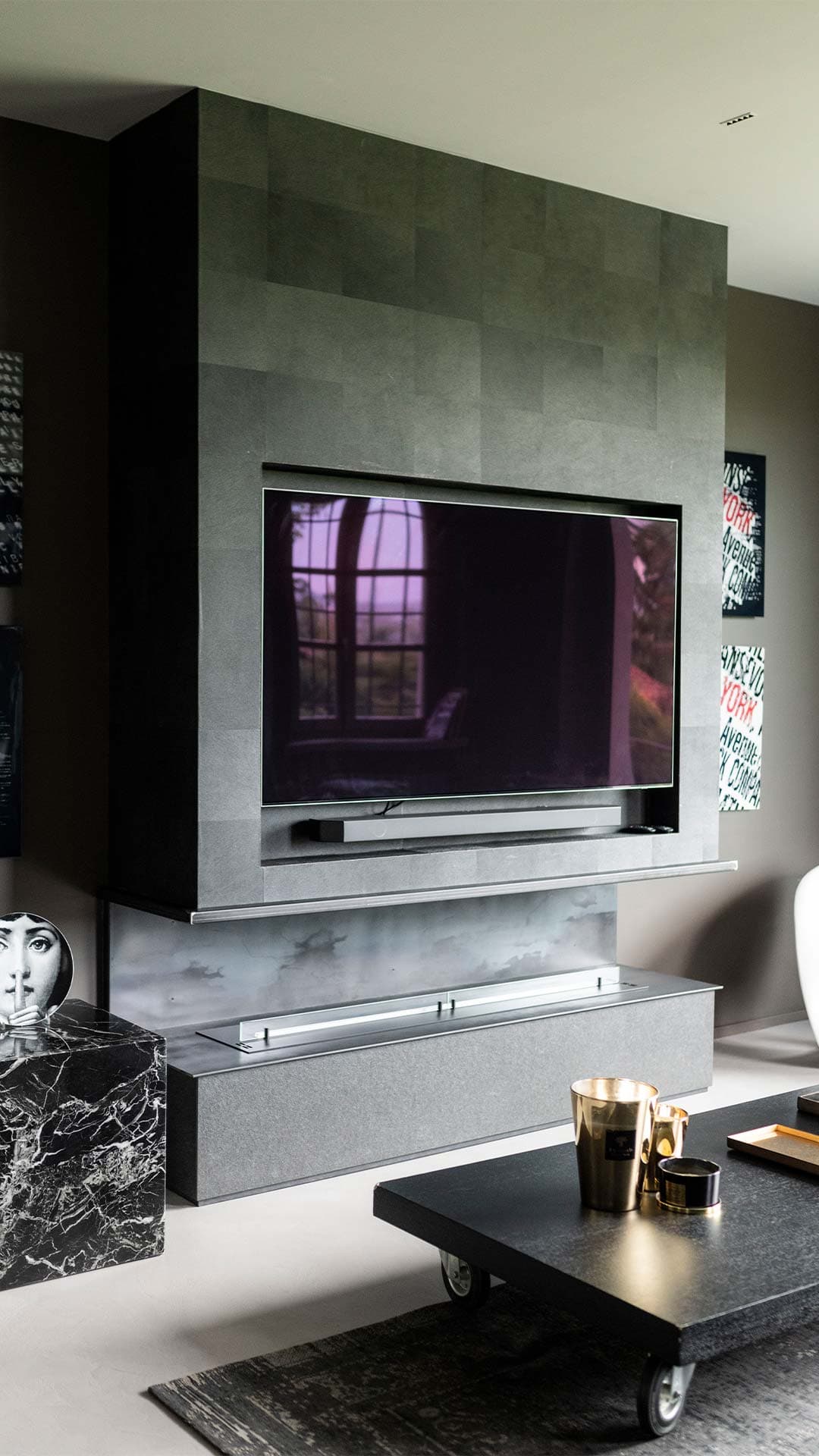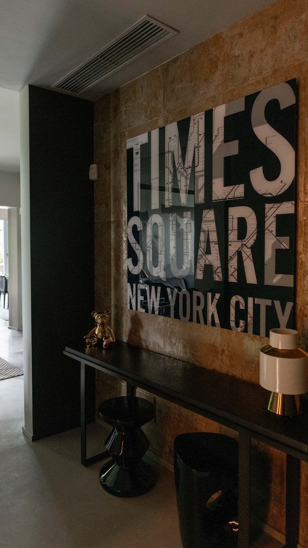 Un angolo living dal design moderno e raffinato, caratterizzato da tonalità scure, elementi artistici e dettagli di arredo unici. La combinazione di materiali materici, come la parete rivestita in carta da parati e il tavolino con ruote industriali, dona all’ambiente un’atmosfera sofisticata e accogliente.