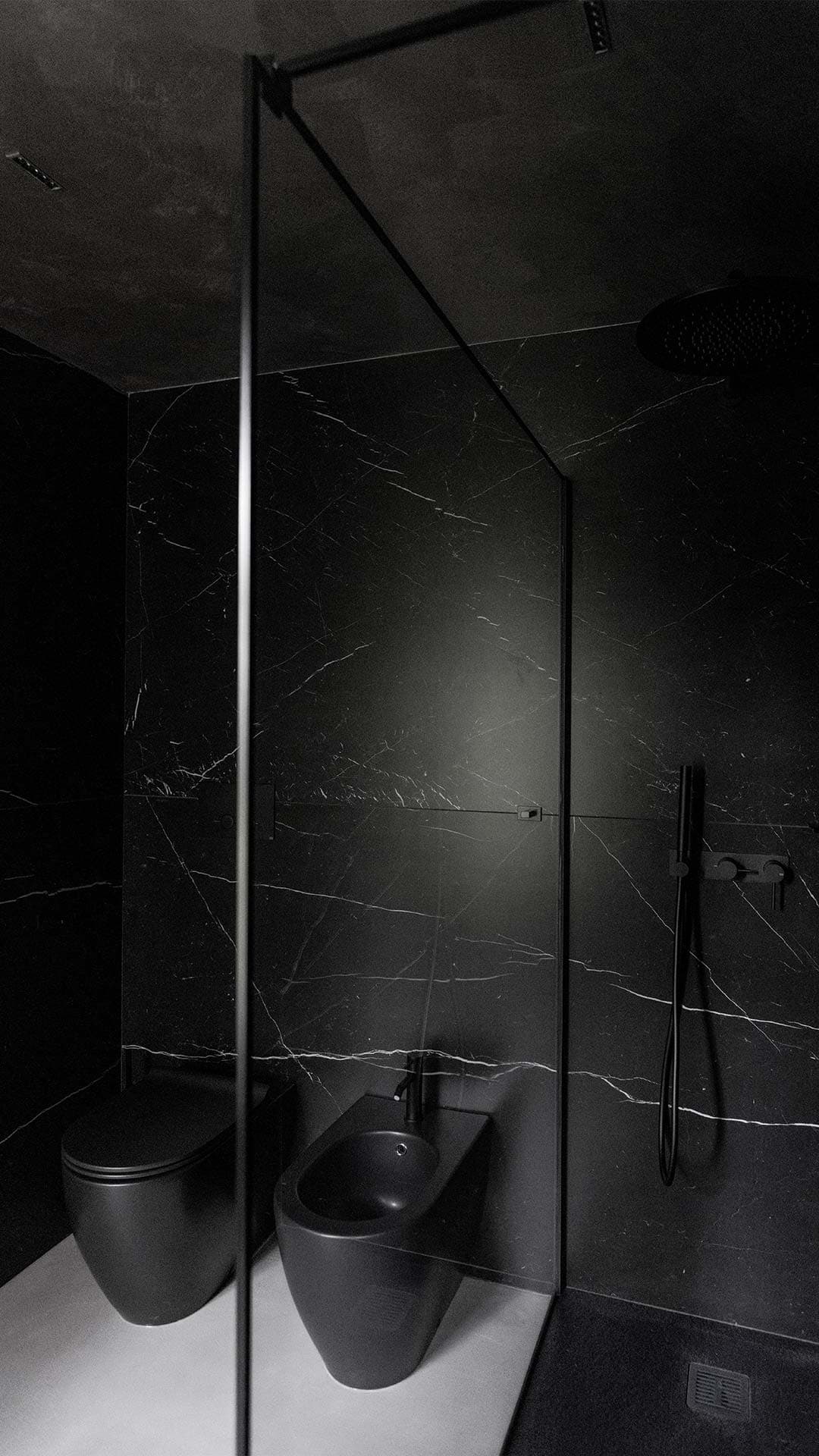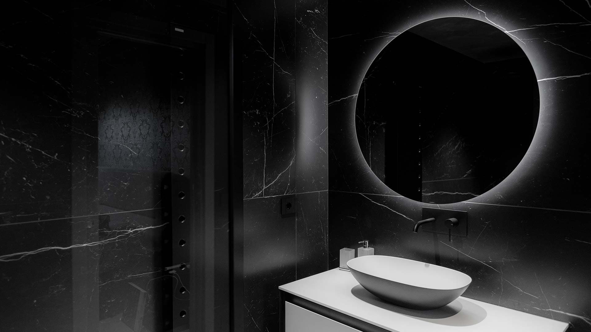 Un bagno di design dallo stile contemporaneo, in cui l’eleganza del nero opaco e la pulizia delle linee si fondono con la funzionalità. Il lavabo d’appoggio su mobile sospeso e lo specchio retroilluminato creano un’atmosfera sofisticata e rilassante, perfetta per un ambiente di benessere esclusivo.